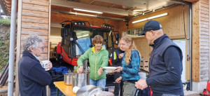 Gegen 13 Uhr waren die ersten HelferInnen wieder am Langlaufzentrum zurück, wo sie mit einer warmen Suppe, Vesper und Kaffee und Kuchen am Lagerfeuer empfangen wurden.